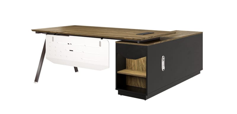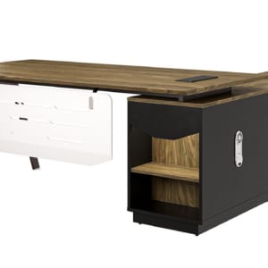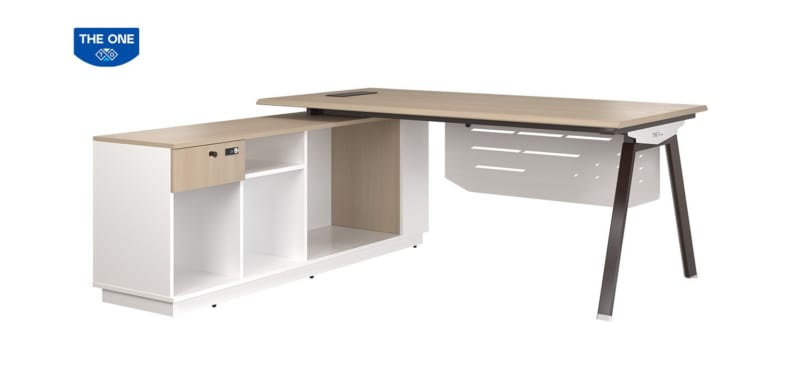 Bàn lãnh đạo NTVP2018C17, chân ống thép biên dạng mới kết hợp yếm tôn, sử dụng gỗ phủ Laminate kết hợp melamine. Phụ kiện cao cấp. Bàn có tủ phụ kiện